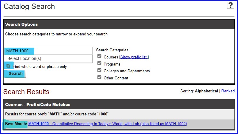 Type in a keyword or phrase (e.g. “Quantitative Reasoning” or “MATH 1000”) then click the magnifying glass. You may directly click on the Advanced Search link to search.