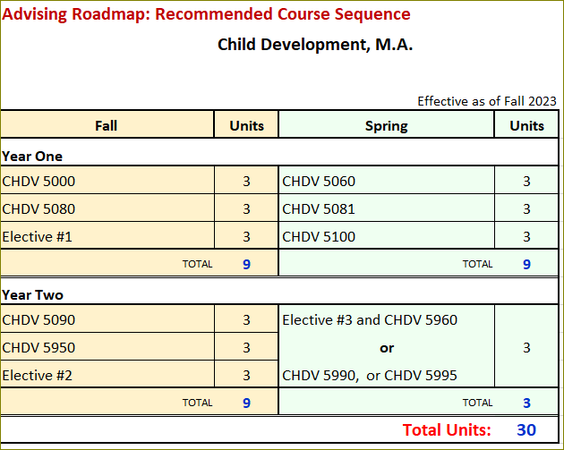 1. Students taking the Comprehensive Examination (CHDV 5960) must select 9 units of electives; Students completing a thesis (CHDV 5990) or Project (CHDV 5995) must select 6 units from the list of electives.